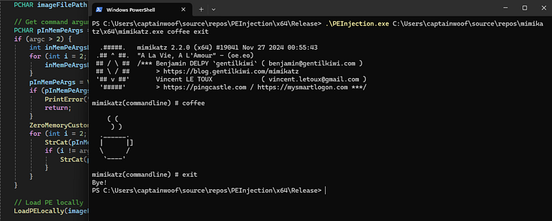 We will start straight with writing the loader. Along the way, I will explain everything relevant about each step, both conceptually and with code. The objective is to write a loader that loads and executes any EXE locally, i.e, within its own process. I chose mimikatz for my demo. Feel free to choose anything.