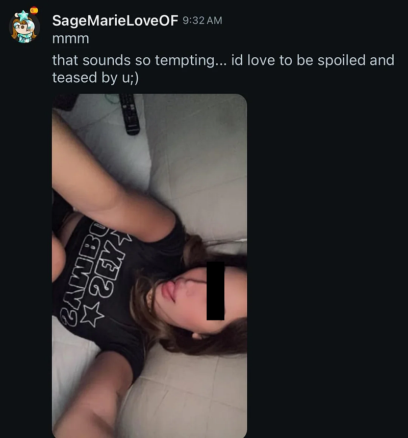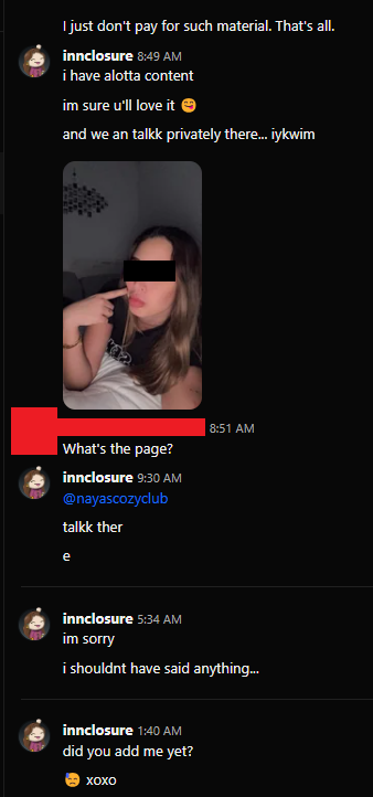 I start off the conversation very humanely, building upon “our” shared interests in music. After a few minutes of the conversation, “she” shills her “OnlyF[a]ns” account. After initially rejecting her requests to sign up on her page, I agree, and she shares the page. And then I go silent for 2 days.