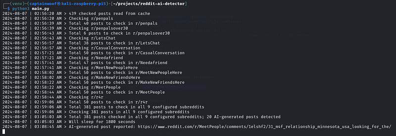 I kept my bot running for days on my Raspberry Pi. Every hour it would scan around 10 subreddits, 500 latest posts. Around 10% of it would be detected as AI-written. And my bot would then proceed to comment this result under the detected post.